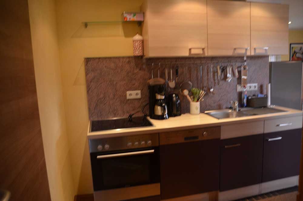 - Küchenzeile im Wohnraum mit Ceran-Kochfeld, Backofen, Geschirrspüler, Kühl-/GefrierKombination, Toaster, Eier- und Wasserkocher, Kaffeemaschine; Heißer Stein/Raclette,