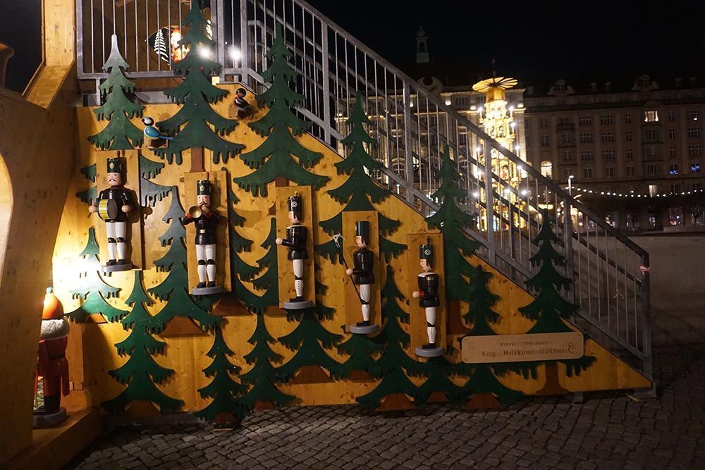 Am Eingang erwartet den Besucher bereits der erste Superlativ, der vermutlich weltgrößte begehbare „erzgebirgische Schwibbogen“ Er sieht aus wie jener berühmte handgeschnitzte Kerzenhalter in Bogenform und bildet das Tor zum Striezelmarkt Der Schwibbogen ist 5 Meter hoch und 13,5 Meter breit. Man kann darüber wandern und den Blick über den Weihnachtsmarkt auf dem Altmarkt genießen. Weithin sichtbar ist die weltgrößte erzgebirgische Stufenpyramide, die mit ihren 14,62 Metern 1999 den Weg ins Guiness Buch der Rekorde fand.
